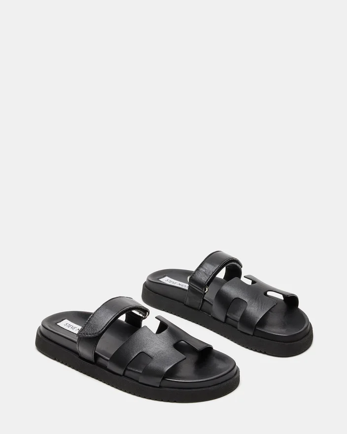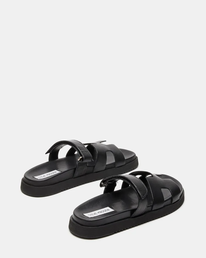 Papucii din piele Mayven prezintă detalii de construcție confortabile, precum o talpă interioară modelată, o talpă plată cu profil și o curea superioară reglabilă, plus o curea frontală cu un design geometric decupat.
