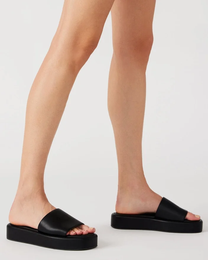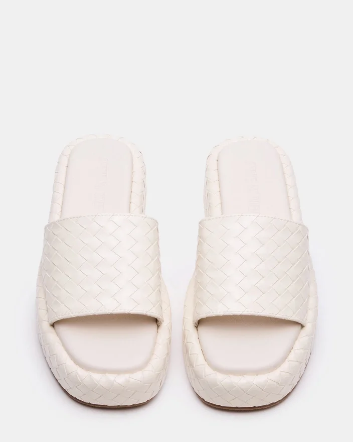 Sandala Beachy cu vârf pătrat are o talpă plată și o curea lată asortată, pentru un aspect texturat extrem de confortabil.