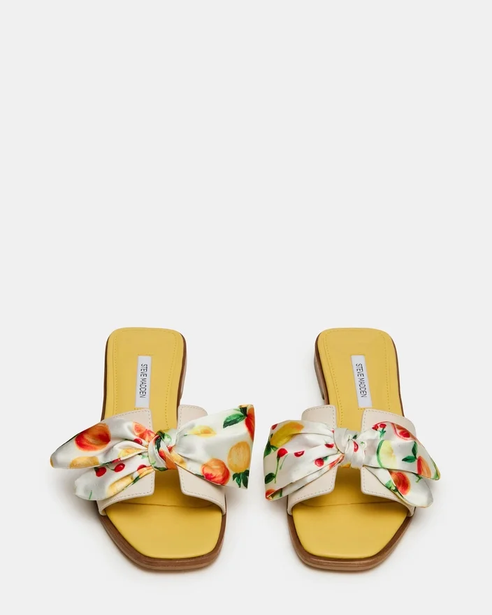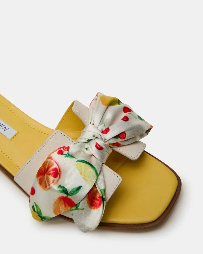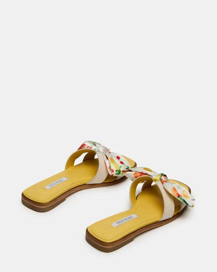 Decupajele geometrice de pe cureaua largă a sandalelor Hadyn Citrus Multi Scarf Slide conferă acestui model de sandale plate un aspect proaspăt.