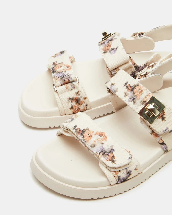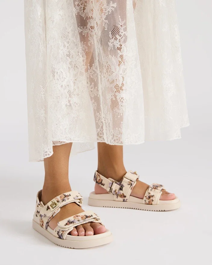 Modelul Mona preia designul clasic al sandalelor cu trei curele, cu talpă interioară modelată și talpă plată, și îl îmbunătățește cu o construcție durabilă și accesorii solide în nuanțe aurii.