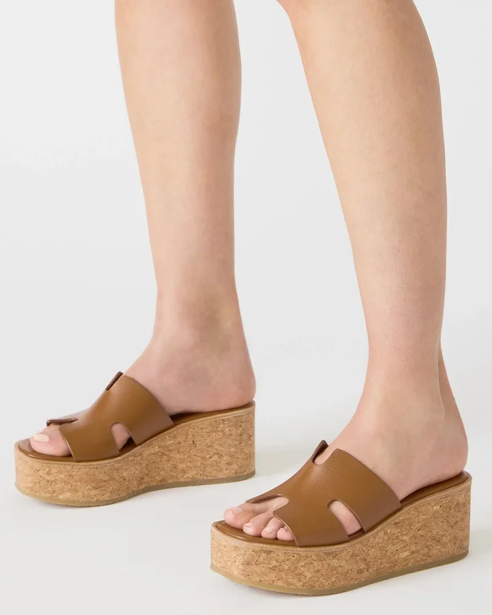 Sandala cu toc în formă de pană Harmony din piele de culoare coniac are o platformă din plută care oferă atât stil, cât și confort pentru a fi purtată toată ziua. Tocul în formă de pană structurat oferă un sprijin stabil fără a sacrifica eleganța. O alegere versatilă pentru trecerea de la ieșirile casual la ocazii speciale.