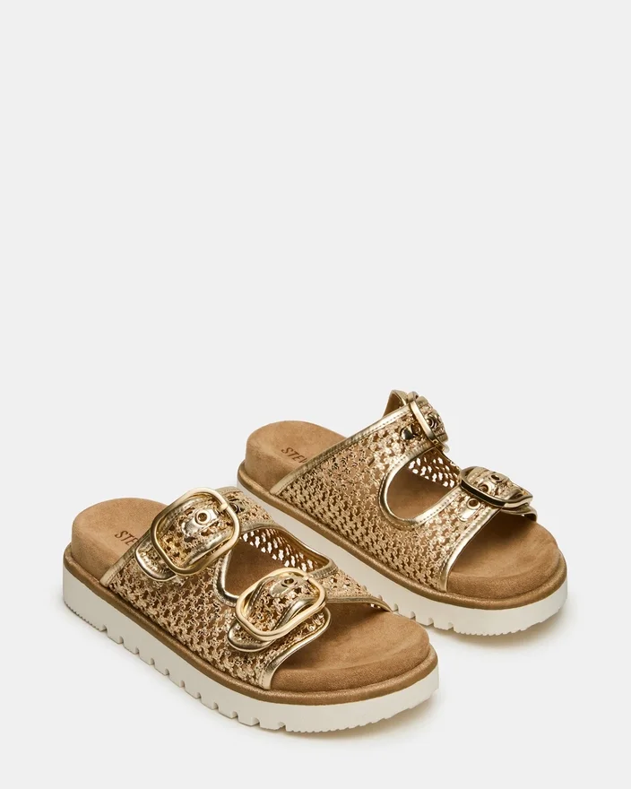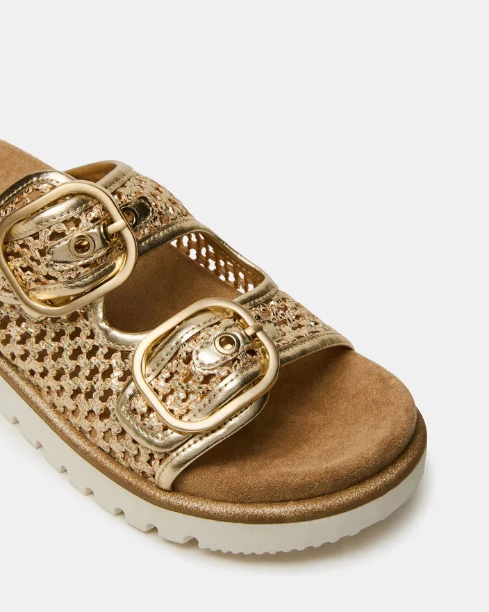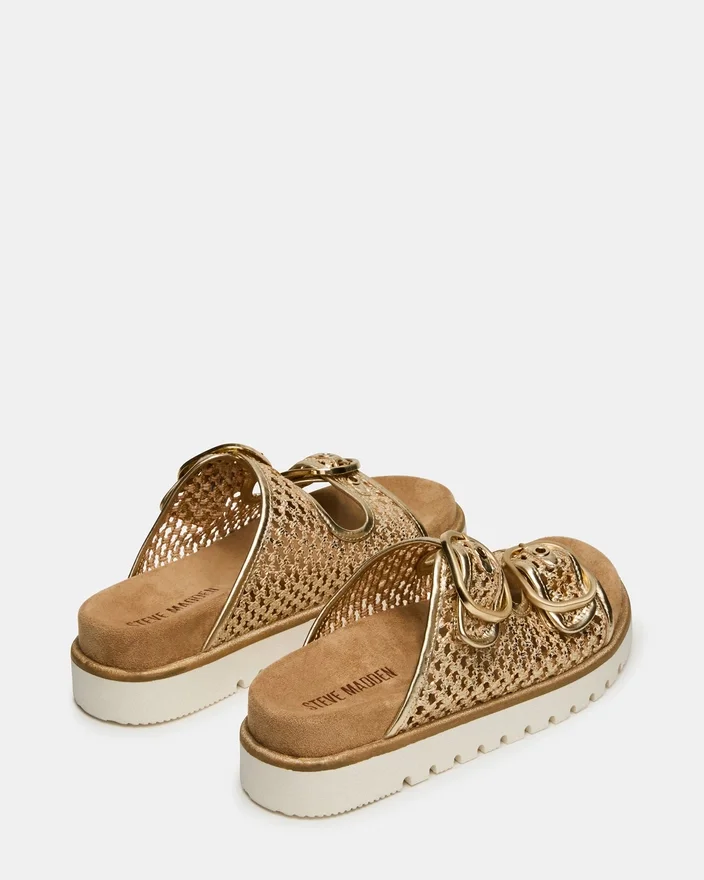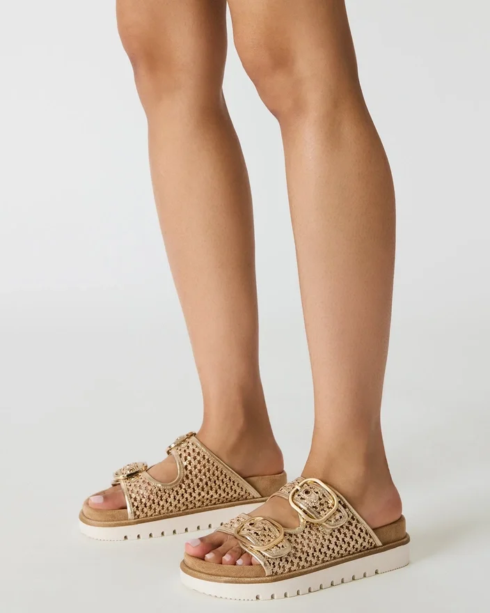 Modelul Shellby Gold este o sandală țesută, realizată cu măiestrie, concepută pentru confort și stil fără efort. Silueta tip slide este prevăzută cu închizători cu cataramă sigure, care asigură o potrivire ajustabilă și stabilitate pe tot parcursul zilei. Talpa conturată oferă susținere pentru arcada piciorului și amortizare, făcând din acest model versatil o alegere ideală atât pentru ieșiri Casual, cât și pentru ocazii relaxate. Construcția țesută asigură o încălțăminte respirabilă, perfectă pentru vremea caldă.